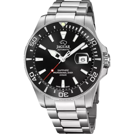 Jaguar Pro Diver nero – J886/3, Colore quadrante: nero, Materiale cassa: Acciaio, Dimensione cassa: 43,5 mm, Materiale bracciale/cinturino: Acciaio, Movimento: Eta 2824-2 (Automatico), Swiss Made, Water Resistant: 20 ATM.