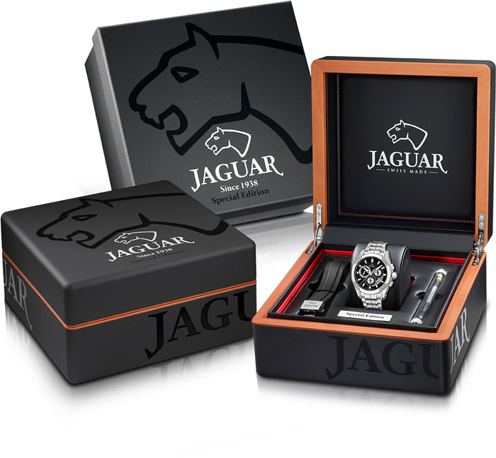 Jaguar Special Edition, Confezione edizione speciale, Colore quadrante: nero, Dimensione cassa: 45 mm, Materiale cassa: acciaio, Materiale bracciale/cinturino: acciaio e cinturino addizionale in gomma, vetro zaffiro, Movimento: Ronda (cronografo al quarzo), Swiss Made, Water resistant: 10 ATM.