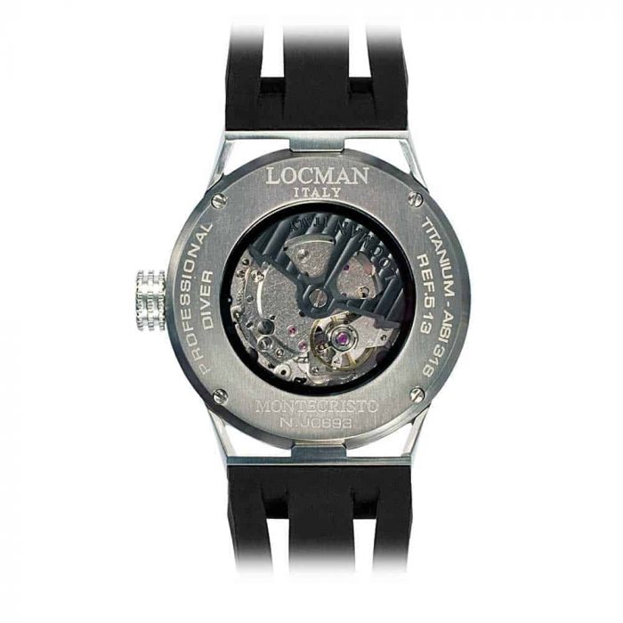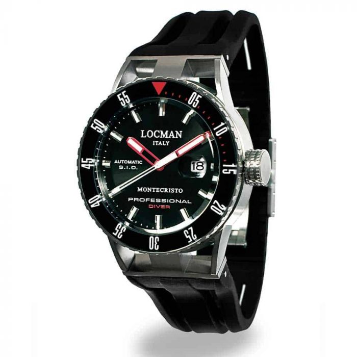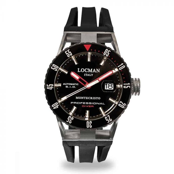 Orologio Locman Montecristo, Colore quadrante: nero, Materiale cassa: acciaio e titanio, Dimensioni cassa: 44 mm, Materiale bracciale/cinturino: silicone, Vetro: vetro minerale antigraffio trattamento zaffiro, Movimento: movimento automatico, Water resistant: 12 ATM.