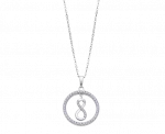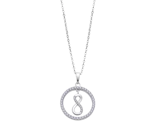 Collana in argento 925, ciondolo a cerchio con simbolo dell’ infinito all’interno, pietre di zirconia da 1 mm e da 1,25 mm, lunghezza 42 cm.