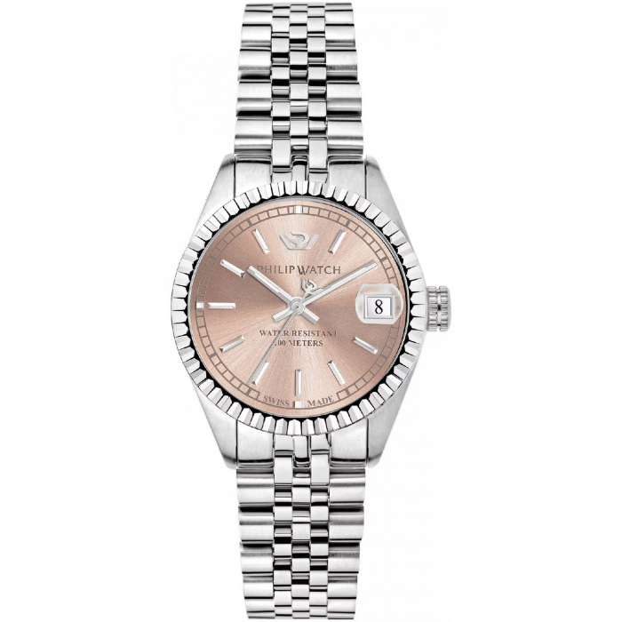 Philip Watch Caribe, Colore quadrante: rosa, Dimensione cassa: 31 mm, Materiale cassa: acciaio, Materiale bracciale/cinturino: acciaio, Vetro zaffiro, Movimento: Eta F05.115 (quarzo), Swiss Made, Water resistant: 10 ATM.